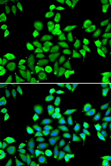 Immunofluorescence analysis of A549 cell using CDC16 antibody. Blue: DAPI for nuclear staining.