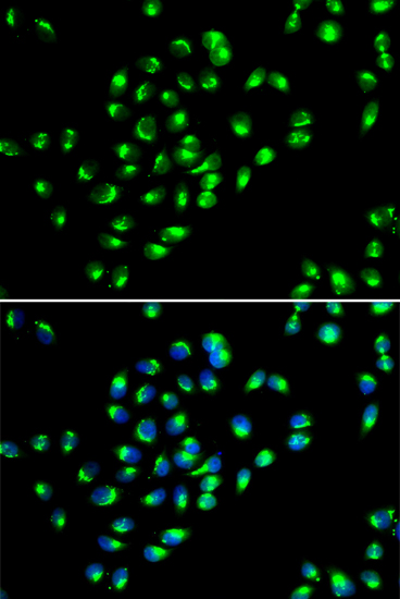 Immunofluorescence analysis of MCF7 cell using GOLM1 antibody. Blue: DAPI for nuclear staining.