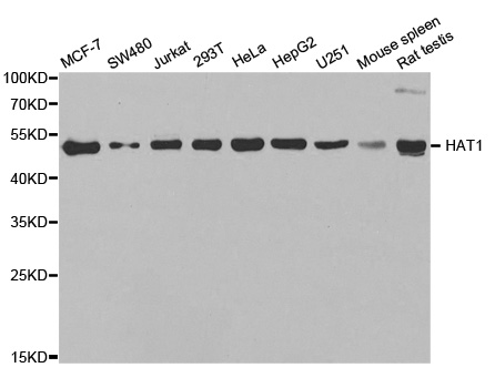 Western blot analysis of extracts of various cell lines, using HAT1 antibody.