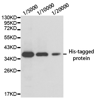 Western blot analysis of over-expressed His-tagged protein in 293T cell using His antibody at different dilution. Each lane was loaded with 2 ug cell lysate.