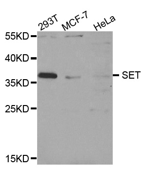 Western blot analysis of extracts of various cell lines, using SET antibody.