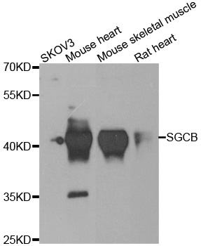Western blot analysis of extracts of various cell lines, using SGCB antibody.