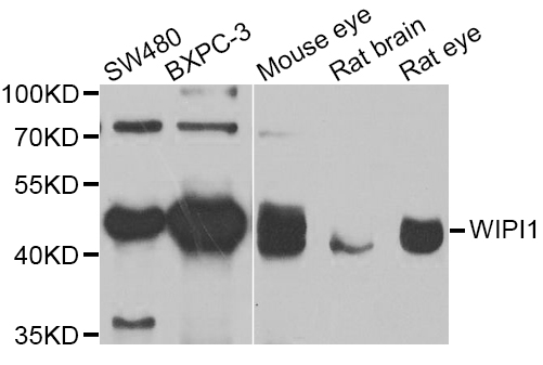 WD40 repeat proteins are key components of many essential biologic functions. They regulate the assembly of multiprotein complexes by presenting a beta-propeller platform for simultaneous and reversible protein-protein interactions. Members of the WIPI subfamily of WD40 repeat proteins, such as WIPI1, have a 7-bladed propeller structure and contain a conserved motif for interaction with phospholipids (Proikas-Cezanne et al., 2004